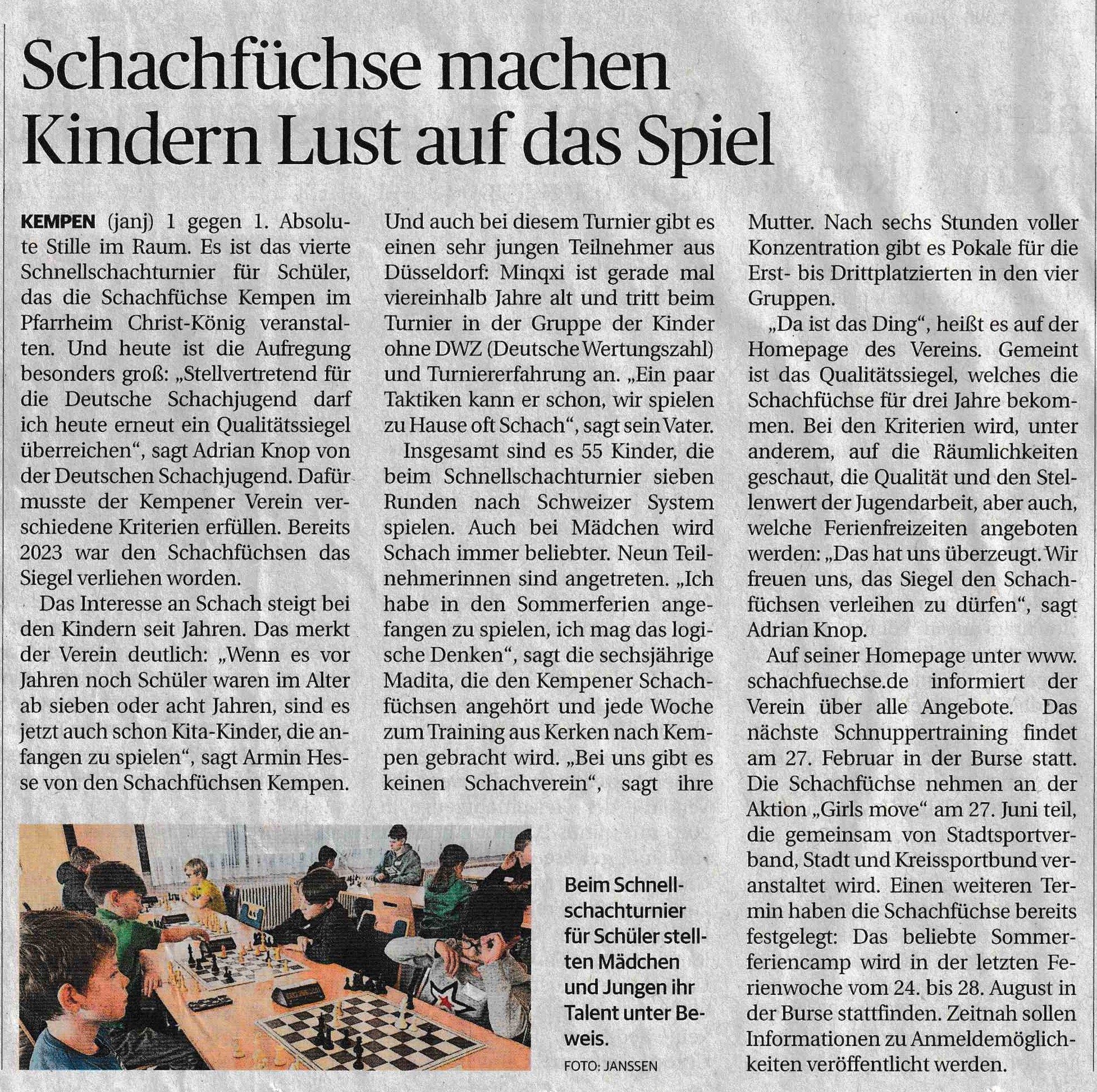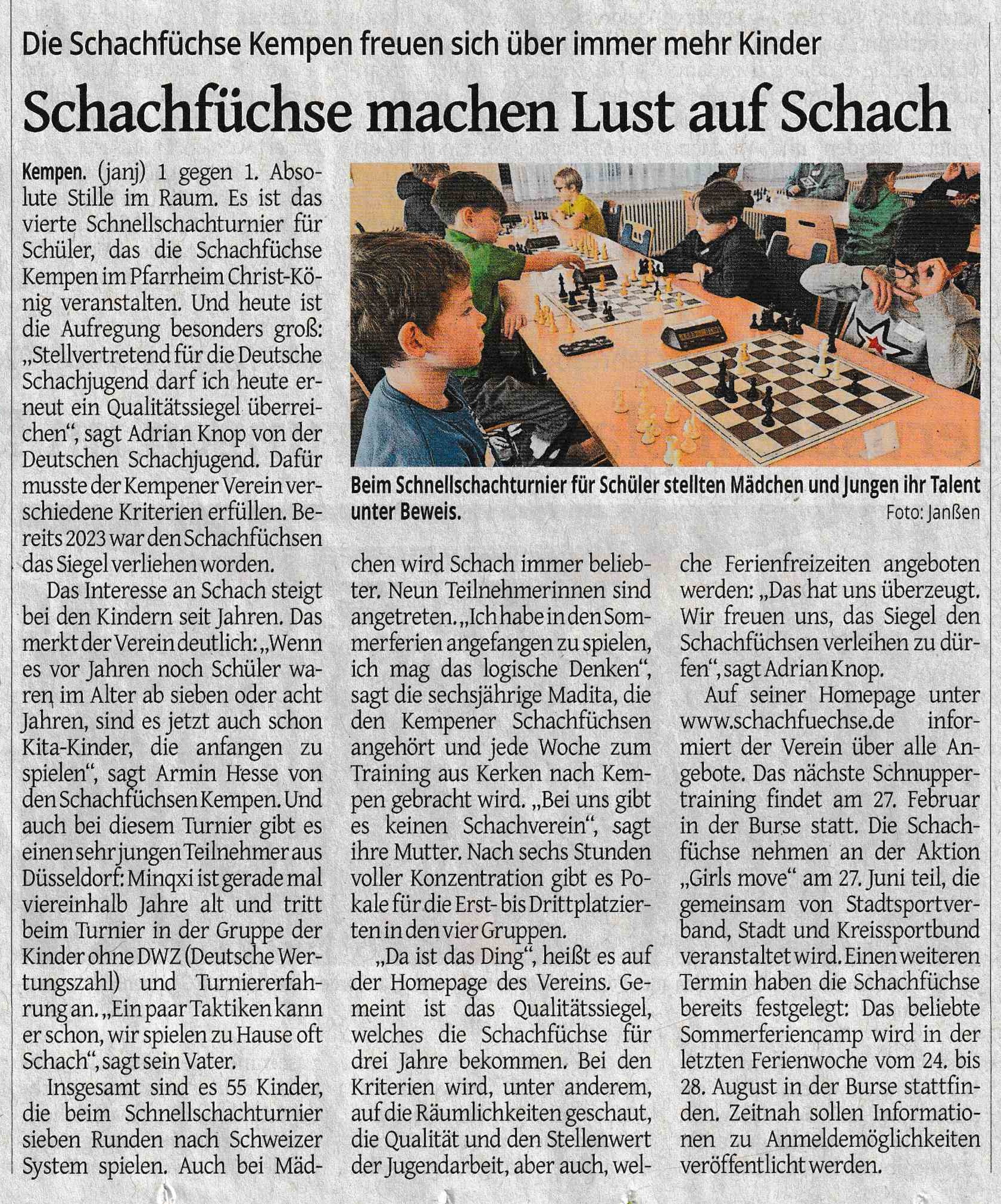 | 07.02.2024 | Großer Zuspruch für Schülerturnier der Schachfüchse